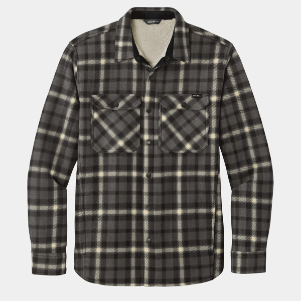 Whether you're spending time inside or outside in cool temps, the high-pile fleece interior of these rugged-looking shirt jacs will keep you warm. Eddie Bauer logo snap-front closure and snap-close chest pockets. Handwarmer pockets. Eddie Bauer woven label at left chest pocket. Made of 10.3-ounce, 100% polyester microfleece bonded with 100% polyester high-pile fleece interior. 100% polyester woven details.